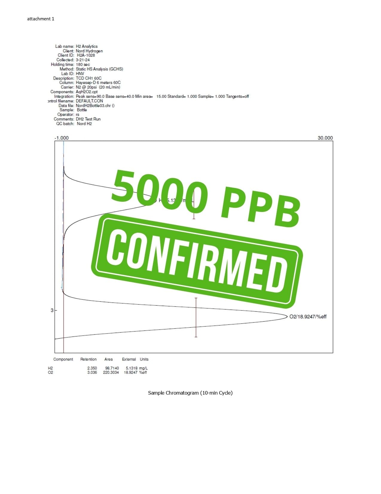 Her ser du en gasskromatografisk analyse fra H₂ Analytics, der vi verifiserer konsentrasjonen av molekylært hydrogen i Nord Hydrogen-flasken. Denne avanserte metoden måler nøyaktig hvor mye H₂ som produseres, og som du kan se i diagrammet – vi når 5000 PPB. Det bekrefter at flasken leverer en stabil og sikker nivå av hydrogen, helt uten uønskede biprodukter som ozon eller fluorid. Vitenskapelig testet, garantert rent.