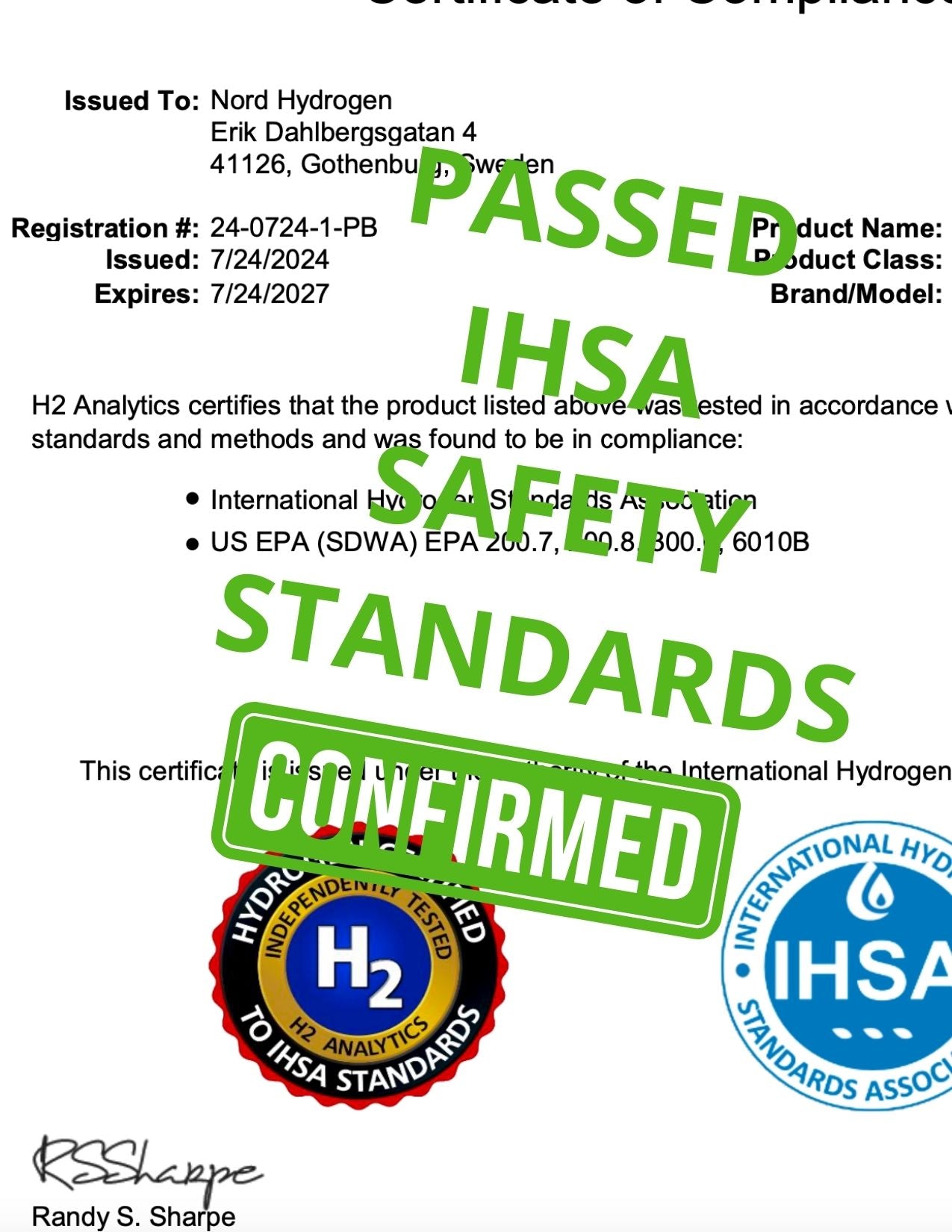 Nord Hydrogen-flasken er godkjent i henhold til IHSA (International Hydrogen Standards Association), en organisasjon som sikrer at produkter med molekylært hydrogen møter strenge kvalitets- og sikkerhetskrav.