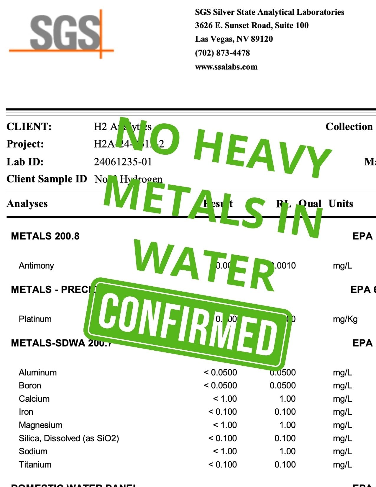 Her ser du resultatet fra en vannanalyse utført av SGS, der vi tester Nord Hydrogen-flasken for eventuelle tungmetaller. Analysen viser at vannet er fritt fra bly, kvikksølv, arsenikk og andre skadelige metaller, noe som bekrefter at flasken holder høyeste sikkerhetsstandard. Du får rent og sikkert hydrogenberiket vann – uten kompromisser.