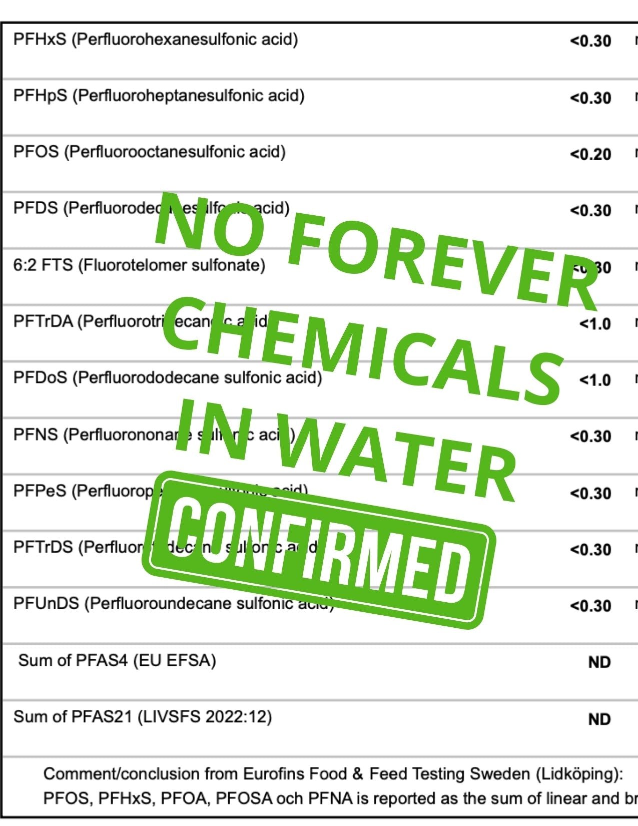 For å sikre at Nord Hydrogen-flasken gir rent og sikkert vann, lot vi Eurofins utføre en PFAS-analyse. Resultatet? Ingen målbare nivåer av PFAS, de såkalte "evighetskjemikaliene". Med andre ord – vannet du drikker er fritt fra disse skadelige stoffene og holder høyest mulig renhetsstandard.